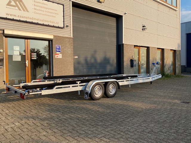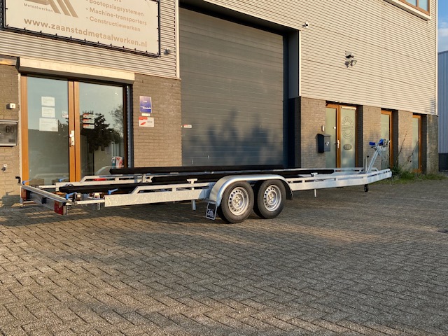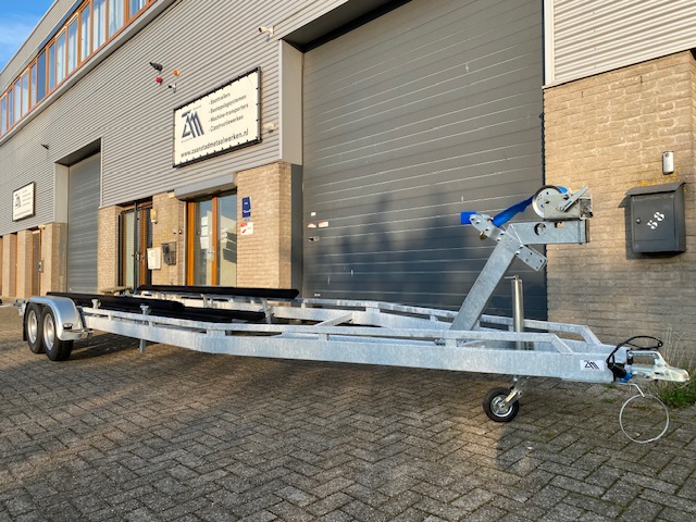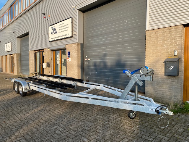 De stallingstrailer 8,3 m 2x1800 kg as is ideaal om uw boot op te stallen. De stallingstrailer is 8,3 meter lang en heeft twee assen van 1800 kg met waterdichte lagers van Knott. Voorzien van 4 stuks gestoffeerde balken. 2 stuks van 4,8 meter en 2 stuks van 3,9 meter. Dit voorkomt krassen en strepen op uw boot. Het robuuste frame is volbad gegalvaniseerd en bestemd voor een lange levensduur.